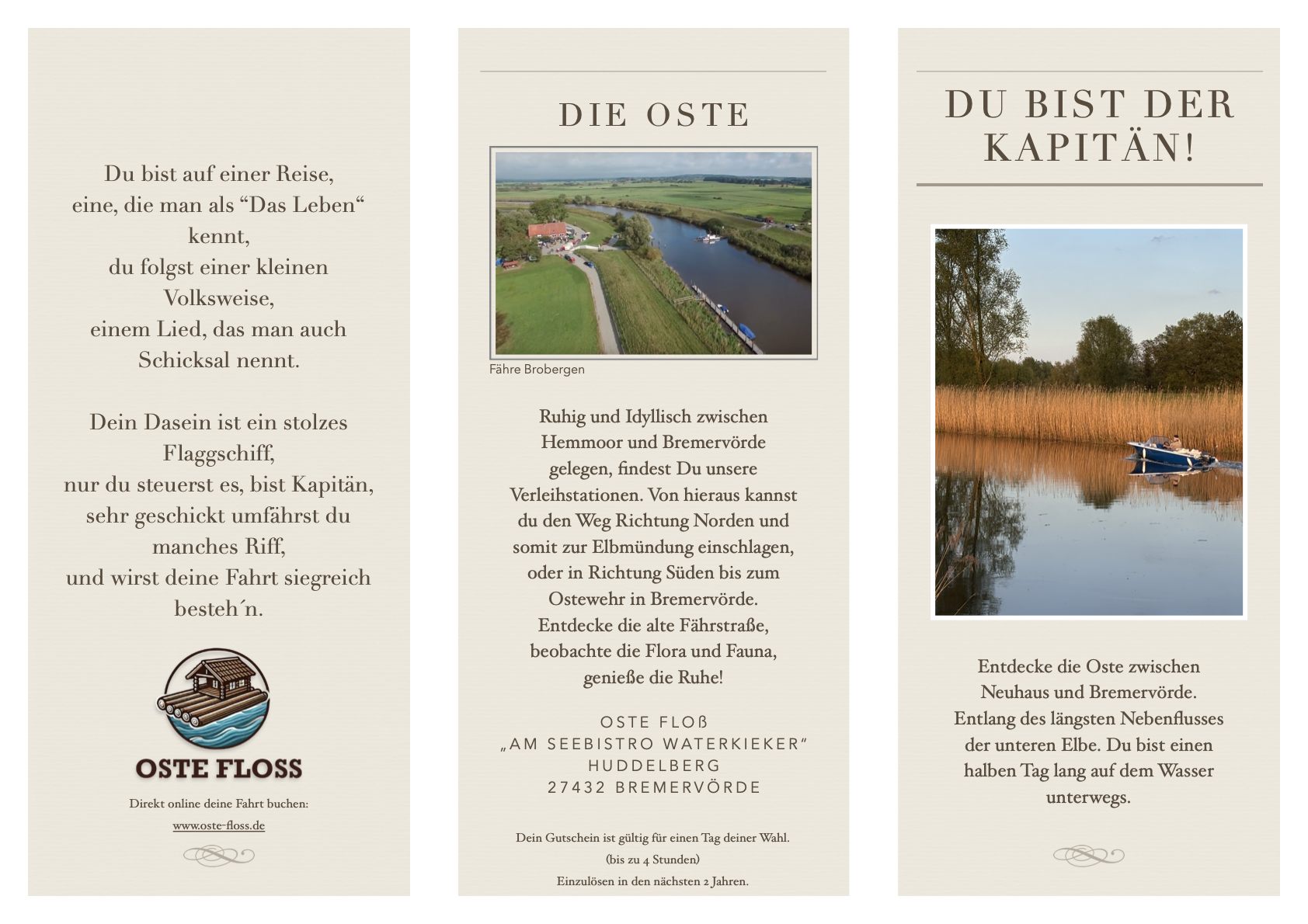 Gutschein für eine Bootstour: Ahoi Kapitän! – Willkommen an Bord. Suche dir eines unserer Motorboote aus und genieße die Zeit auf der Oste mit deinen Liebsten. Für 80 Euro erhältst du einen 4 Stunden Gutschein, für 150 Euro einen 8 Stunden Gutschein.